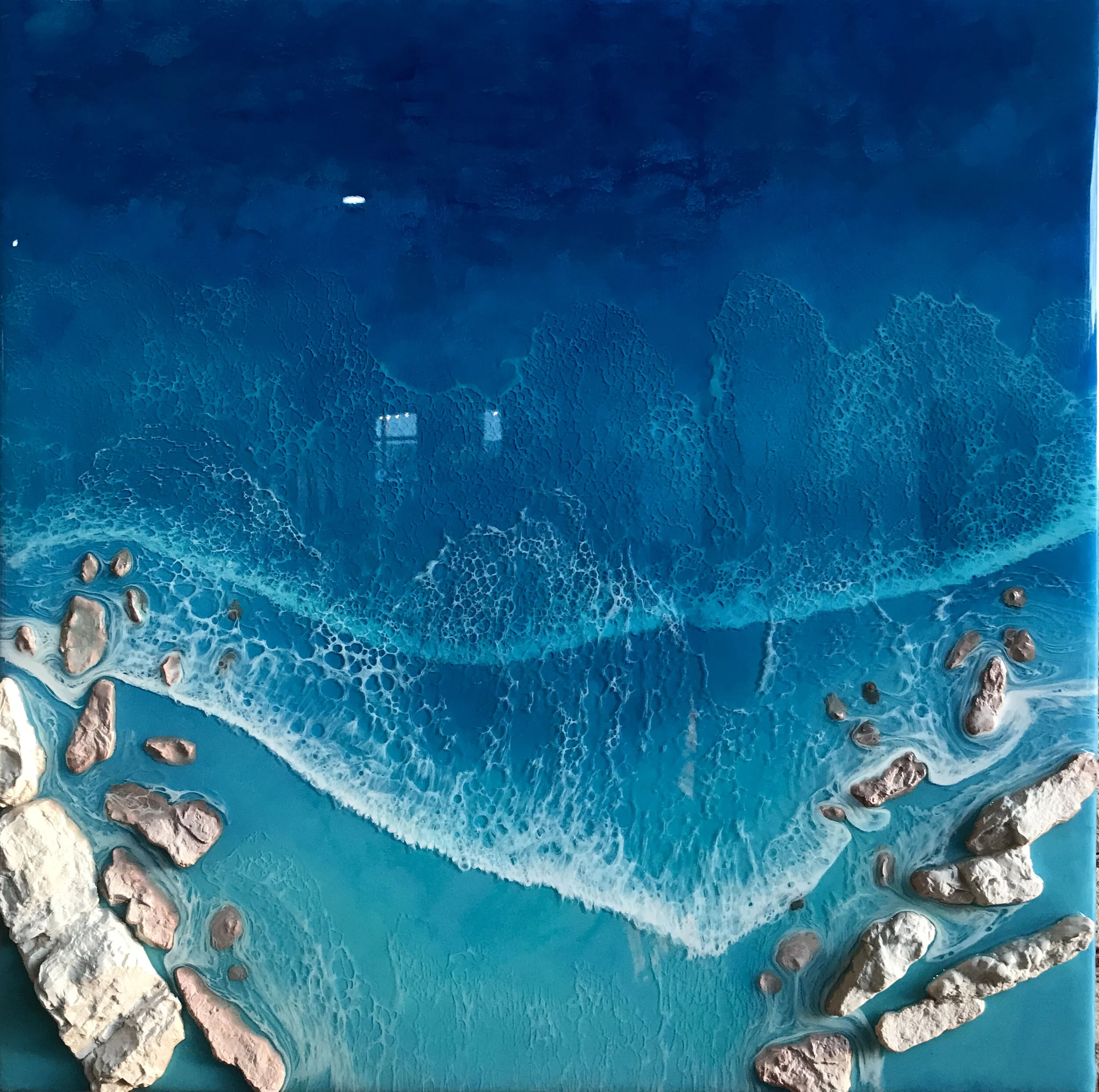 2x2 ft. cradled wooden panel, mixed media and resin, polymer clay rocks.