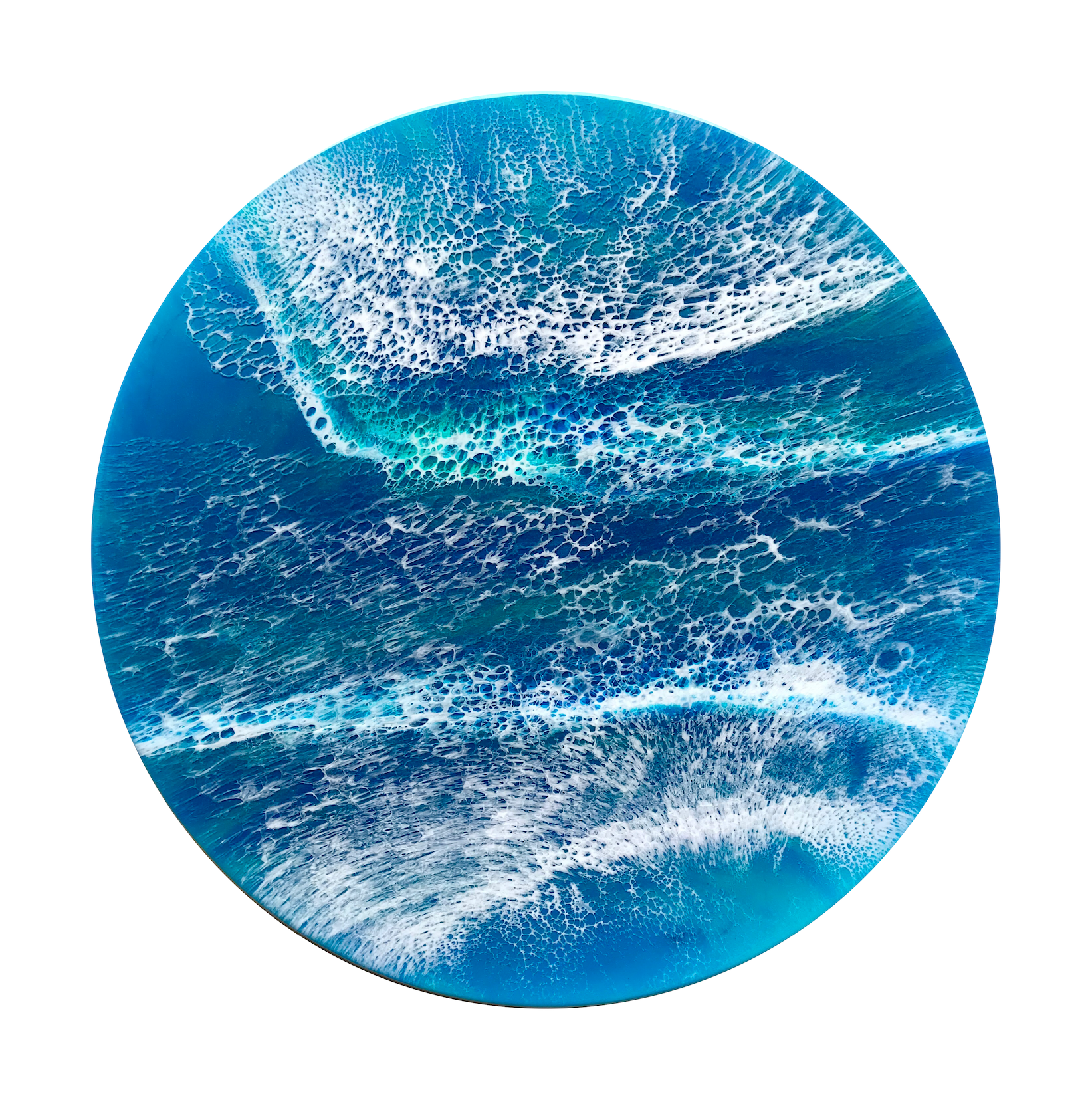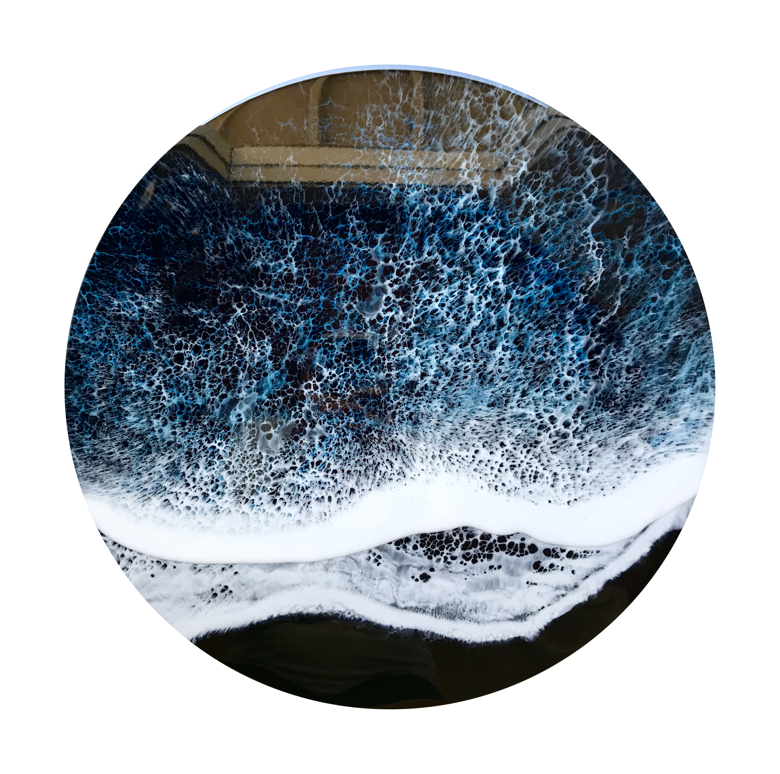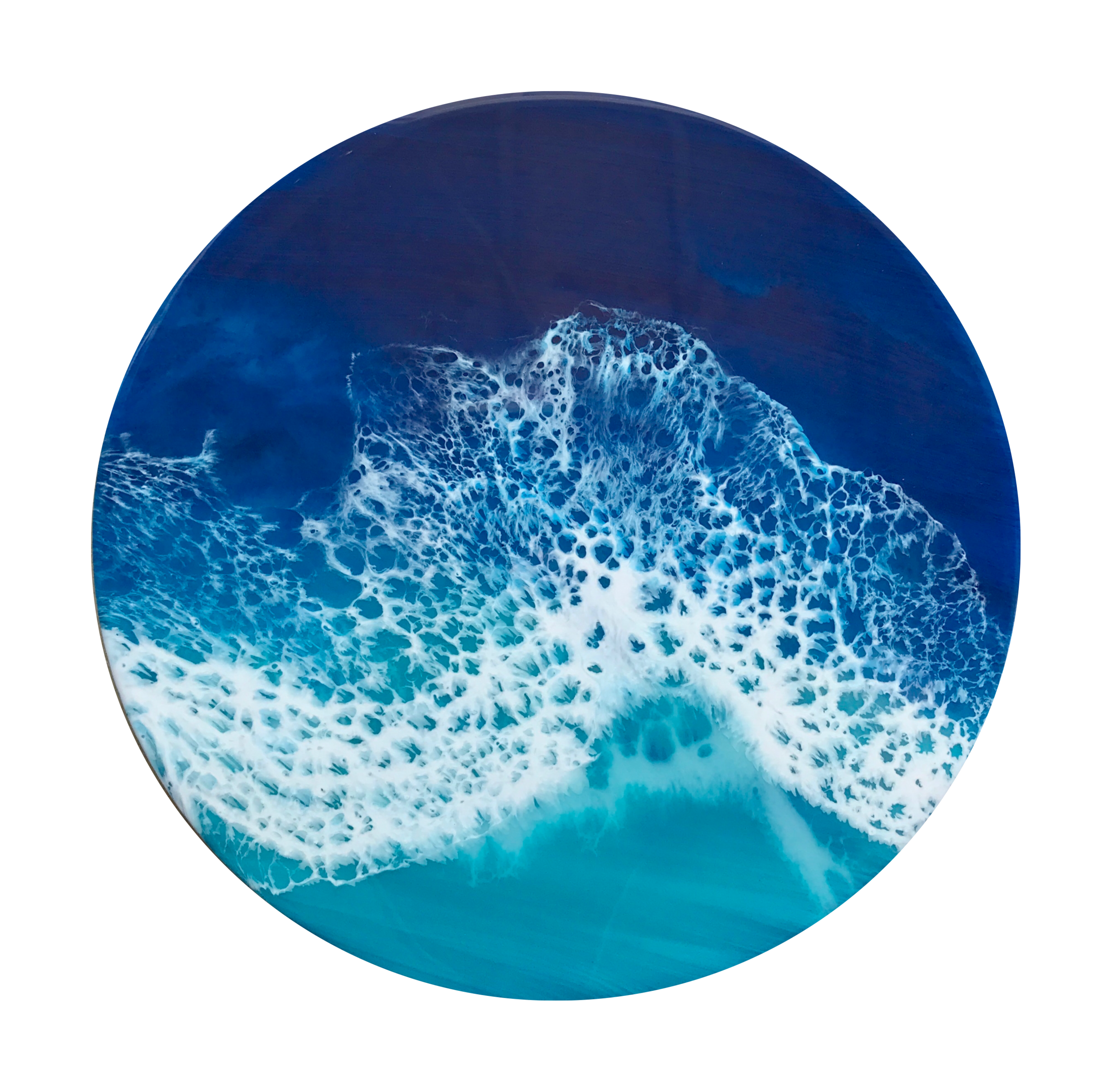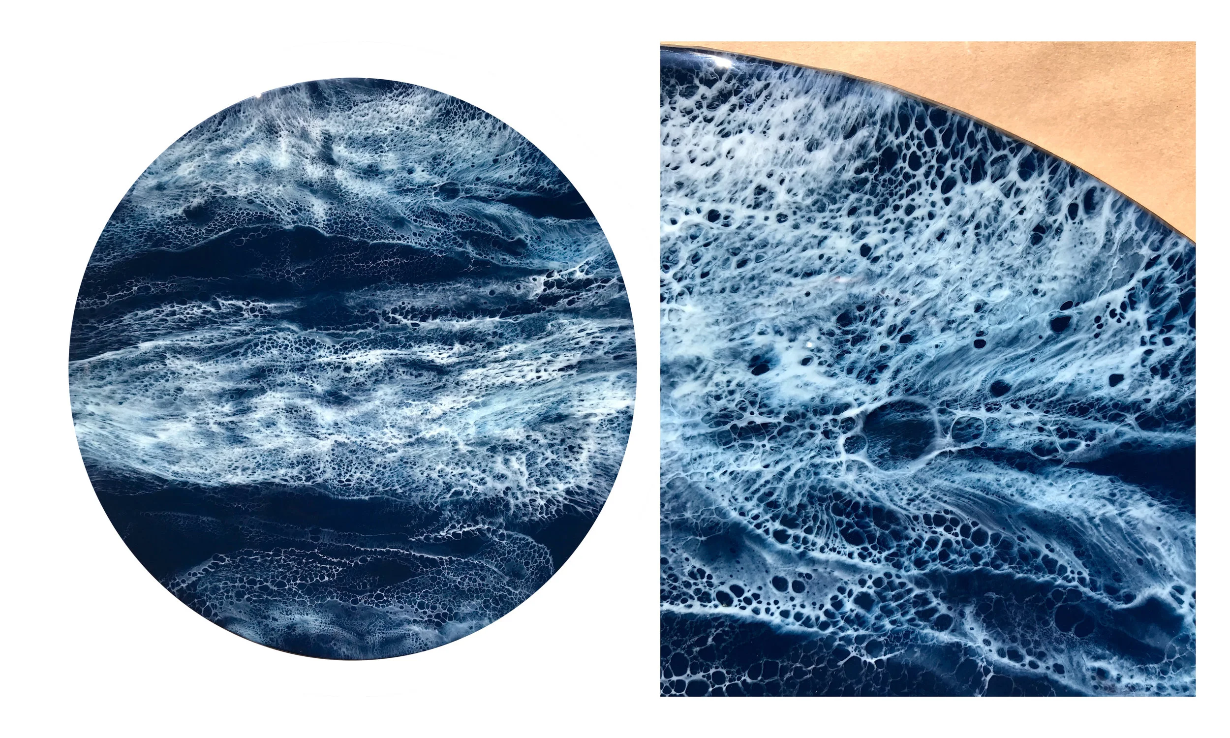 10 in. round wooden board, mixed media and resin, w/ polymer clay rocks.